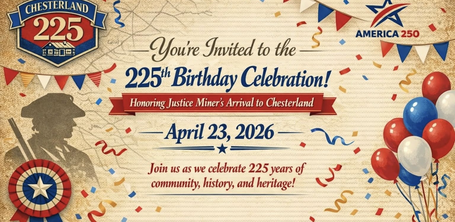 Chester Township will celebrate its 225th anniversary April 23, with community festivities honoring early settlers Justice and Mabel Miner, who arrived in the area in 1801.