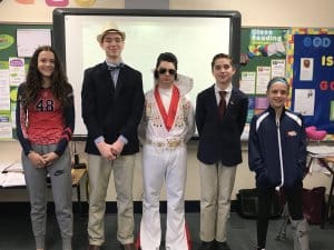 A few weeks ago, Elvis was spotted at NDES, except it wasn’t Elvis, but a seventh-grade student impersonating him and sharing his life story during Mrs. Kelly Stefanek’s English language arts class. In addition to studying literature and basic writing mechanics, students investigate different types of speeches and the different hooks and angles speakers use to engage an audience.