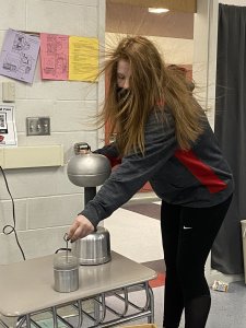 Eighth-grade science students had an electric week in class not too long ago. While using social distancing practices, students had the opportunity to experience static charge using a tesla coil, which is a radio frequency oscillator that produces voltage at low currents, and a Van de Graaf machine, which is an electrostatic generator that produces electricity at low current levels. Together, the two provide some insight into the concepts of forces being contact and non-contact in terms of static.