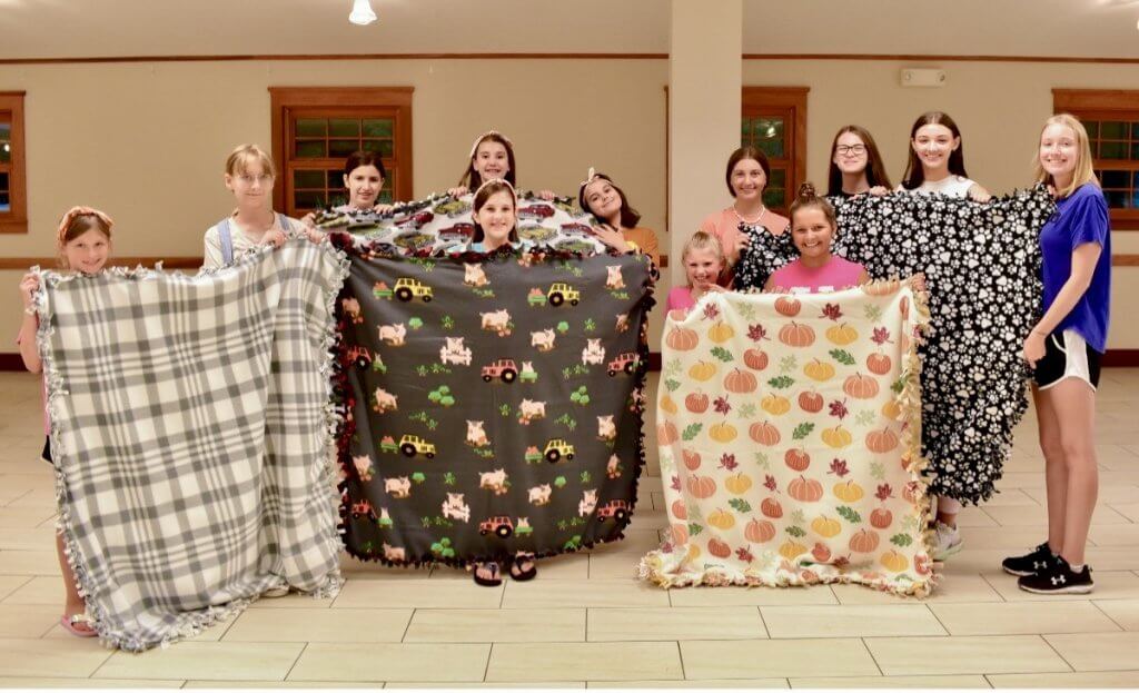 The service projects are amazing for the community and build character in the club members. A club favorite is veteran blanket making. The activity includes having members chip in on all kinds of fleece fabric to create no sew tie blankets out of two pieces of fleece. The blankets are created by three to four club members each and are all donated to veterans in need, veteran organizations, shelters or assisted living homes. The service project brings much joy to the community and builds on acts of kindness within the 4-H club.