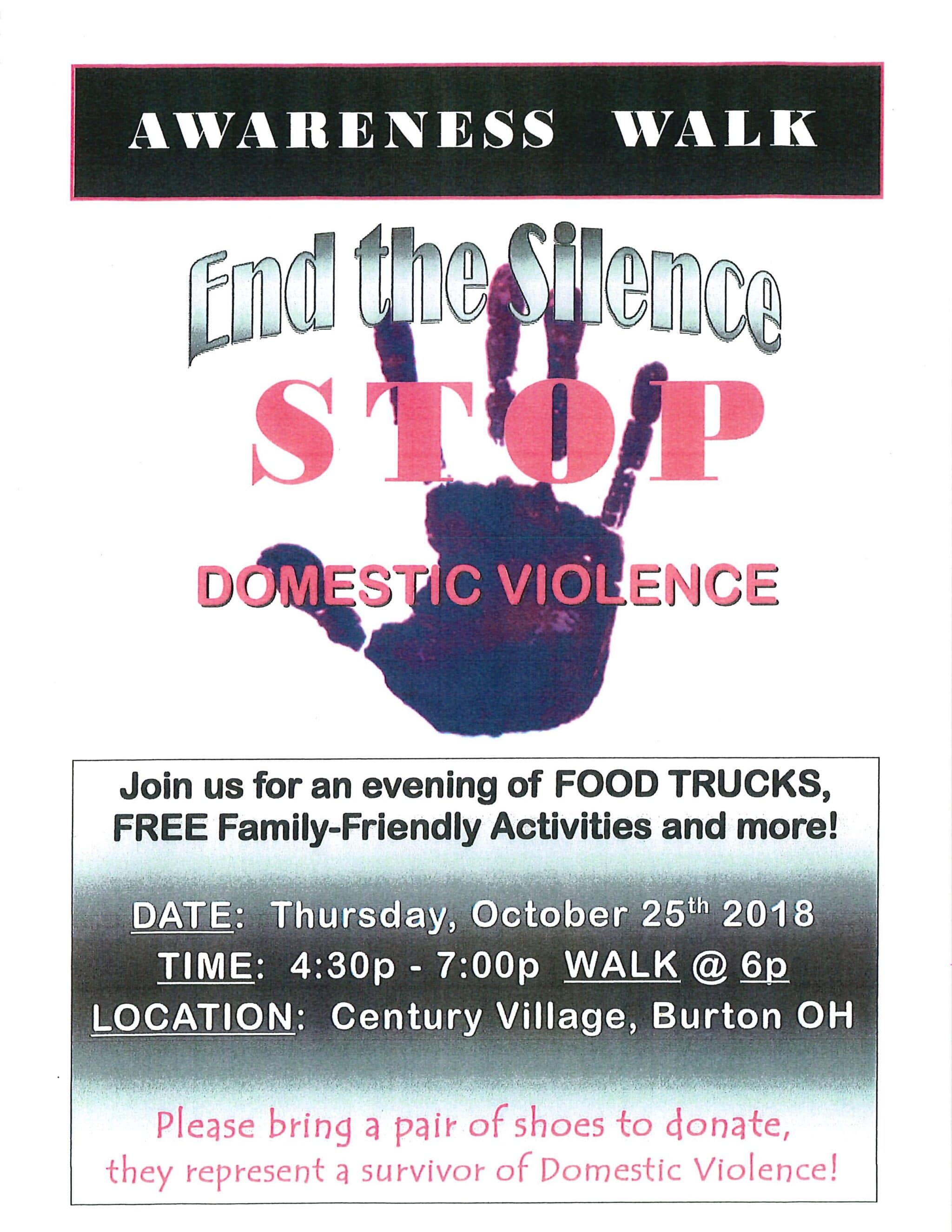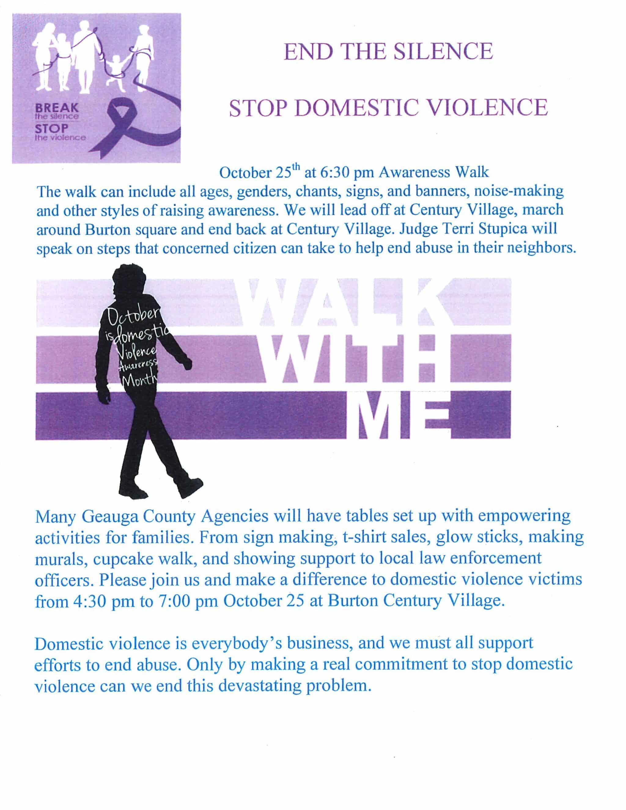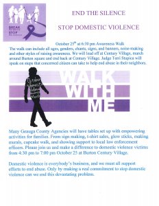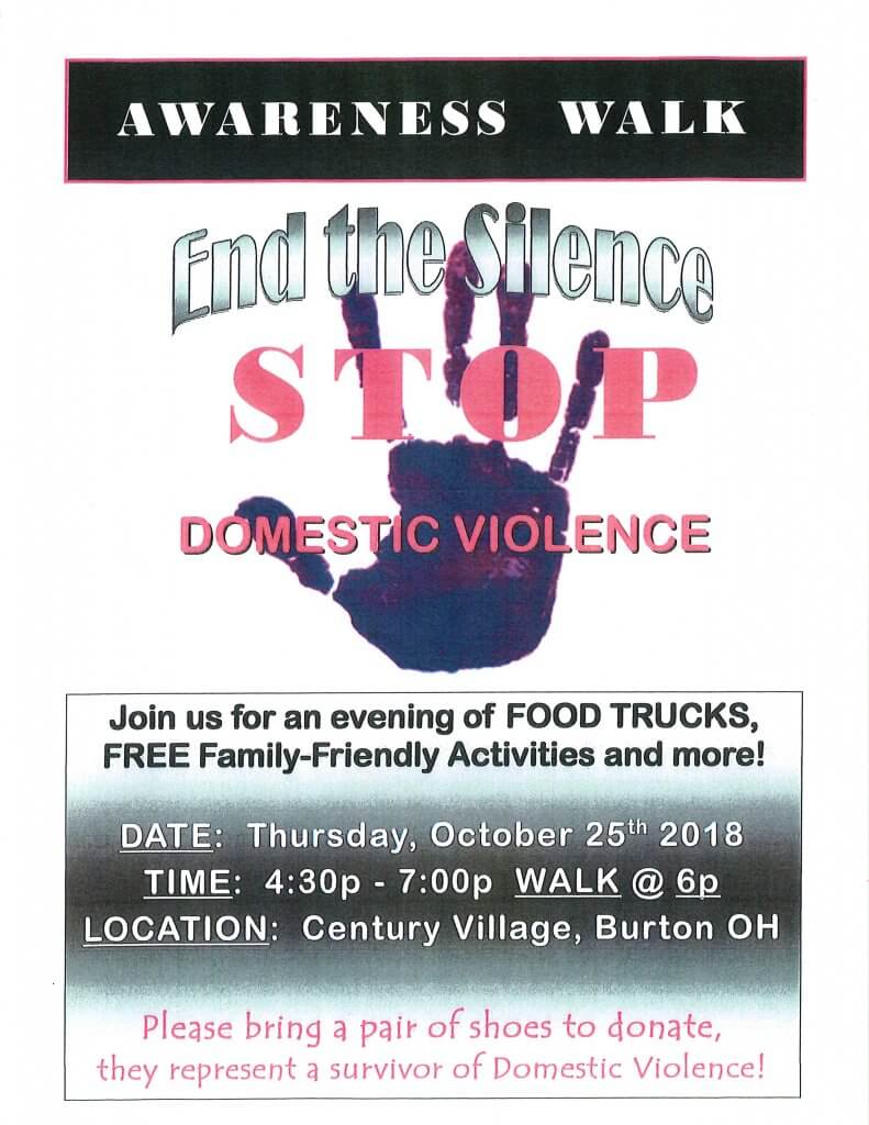 The Awareness Walk will begin at 6:30 p.m. and is being led by Geauga’s local judges. The walk can include all ages, genders, chants, signs and banners, noise-making and other styles of raising awareness. The walk will lead off from Century Village, march around Burton Square and end back at Century Village.