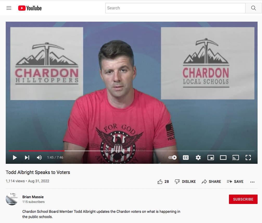 He states in the video that he is speaking as a citizen and does not represent the board. Unfortunately, in the video Mr. Albright has two official, board-approved Chardon Schools logos posted in the background. To the general public, this is minimally a mixed message. The statements of elected public officials are rarely heard as private opinion.