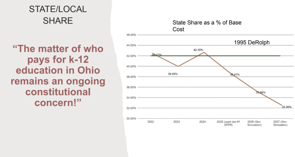 During the DeRolph case, the state’s share of the base cost to educate a student was around 42%, he said, adding at the current moment, the state share is around 38%. Under the proposed budget, it would fall to 32%.