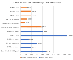 “As requested, my office ran the comparison of current Aquilla Village taxes per $100,000 value versus what we believe the taxes would be if (the village) dissolved and under Claridon as part of the township,” he wrote. “It would seem that Aquilla Village residents would see their tax burden fall to approximately 46% of their current amount.