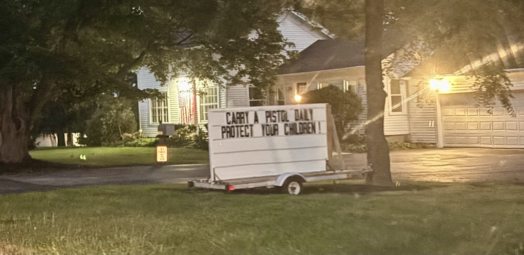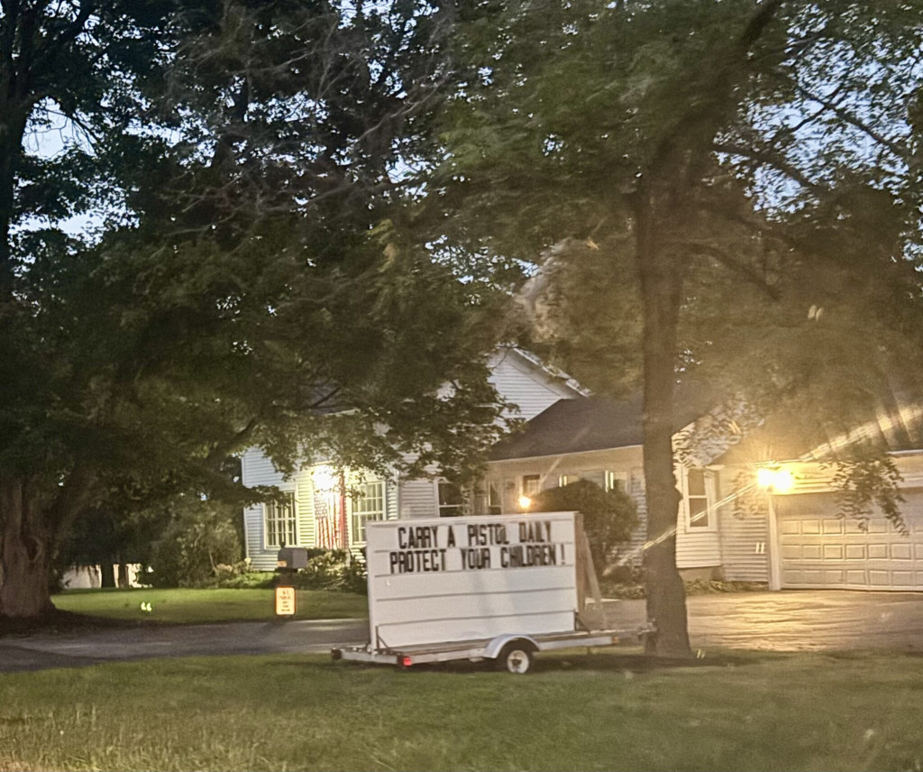 A roadside sign in Bainbridge Township reading, “Carry a Pistol Daily, Protect Your Children!” ignited outrage among residents and officials Sept. 8.