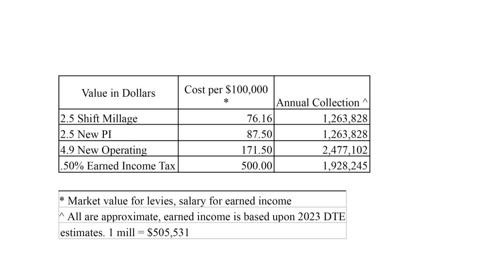 “Income tax takes 18 months to collect. You would have to overlap a year,” she said. “If the EIT passes in November, it will (take effect) in 2026 — too late to shift the millage back. You could unshift (the transferred millage) for ‘27.”