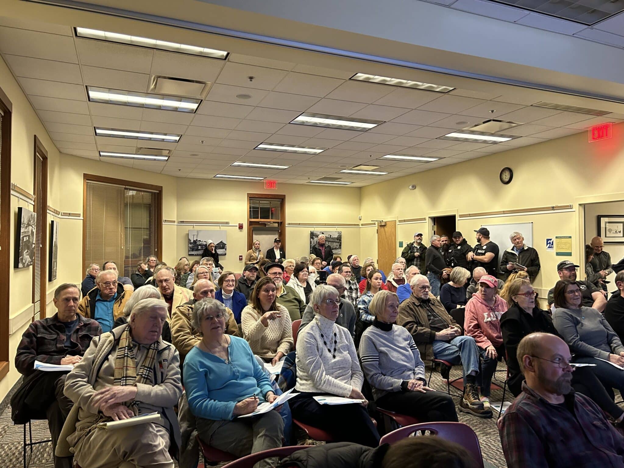 At least three village police officers were visible standing at the back of the room, but no serious security measures were needed, according to an officer on the scene.
