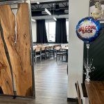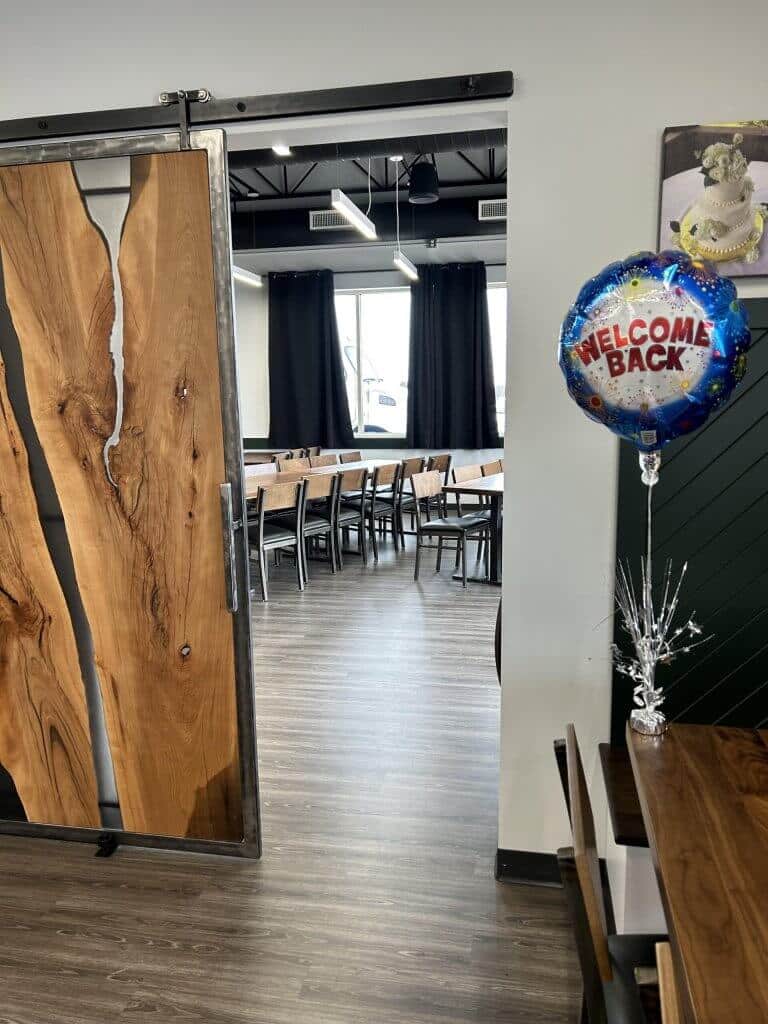 Schneider pointed out the beautiful hand-made walnut table tops and chairs in the party room, the counters and, especially, the sliding barn door that closes off the party room from the café.