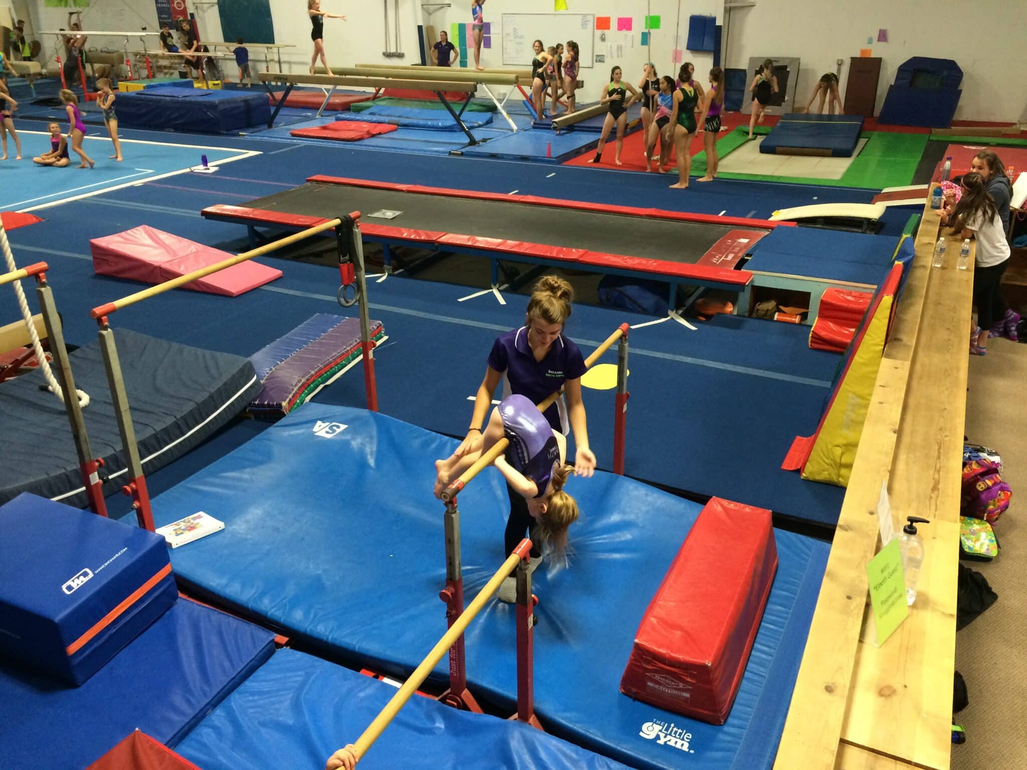 “Nice landing,” one coach said to a nearby ponytailed gymnast.