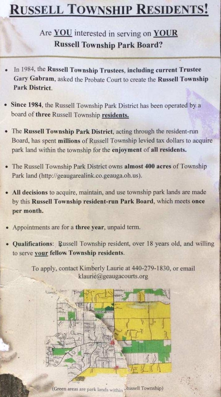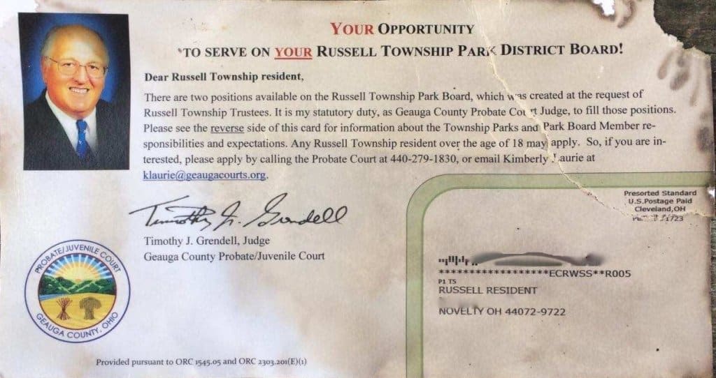 “It is my statutory duty as Geauga County Probate County Judge to fill these positions,” Grendell stated on the postcard. “Any Russell resident over the age of 18 may apply.”