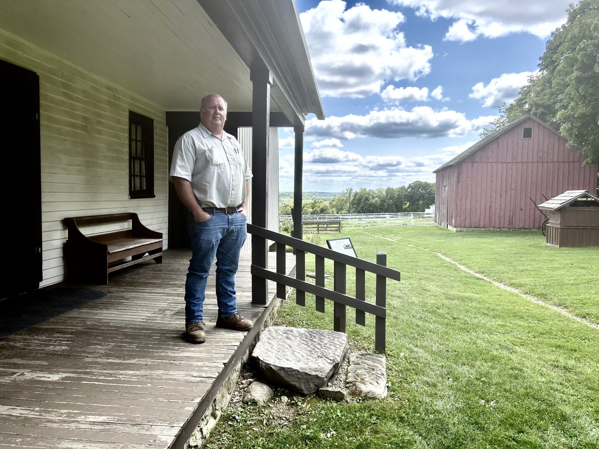 Geauga County Historical Society Treasurer Jim Vinecourt stands on the porch of the Cook House, a 218-year-old structure, in the Century Village Museum in Burton Village. The museum is in need of financial support and the community is stepping up with it, he said.