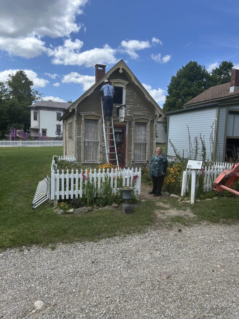 Bill Troyer paints the trim on a building in the Century Village Museum. He has been maintaining the facility for 42 years, said Geauga County Historical Society Treasurer Jim Vinecourt. Also pictured is Stefanie O’Connor, museum curator, archivist and grant writer hired in February.