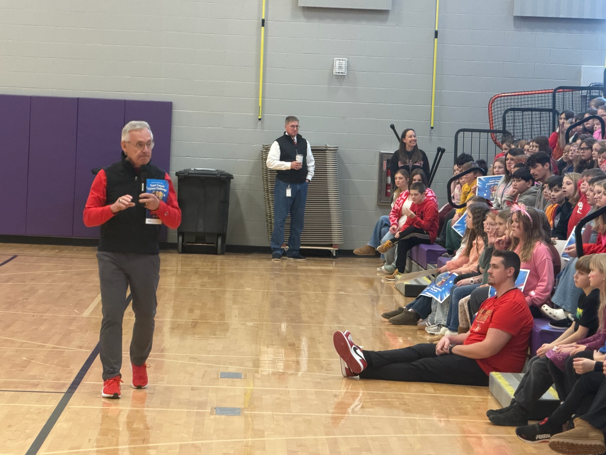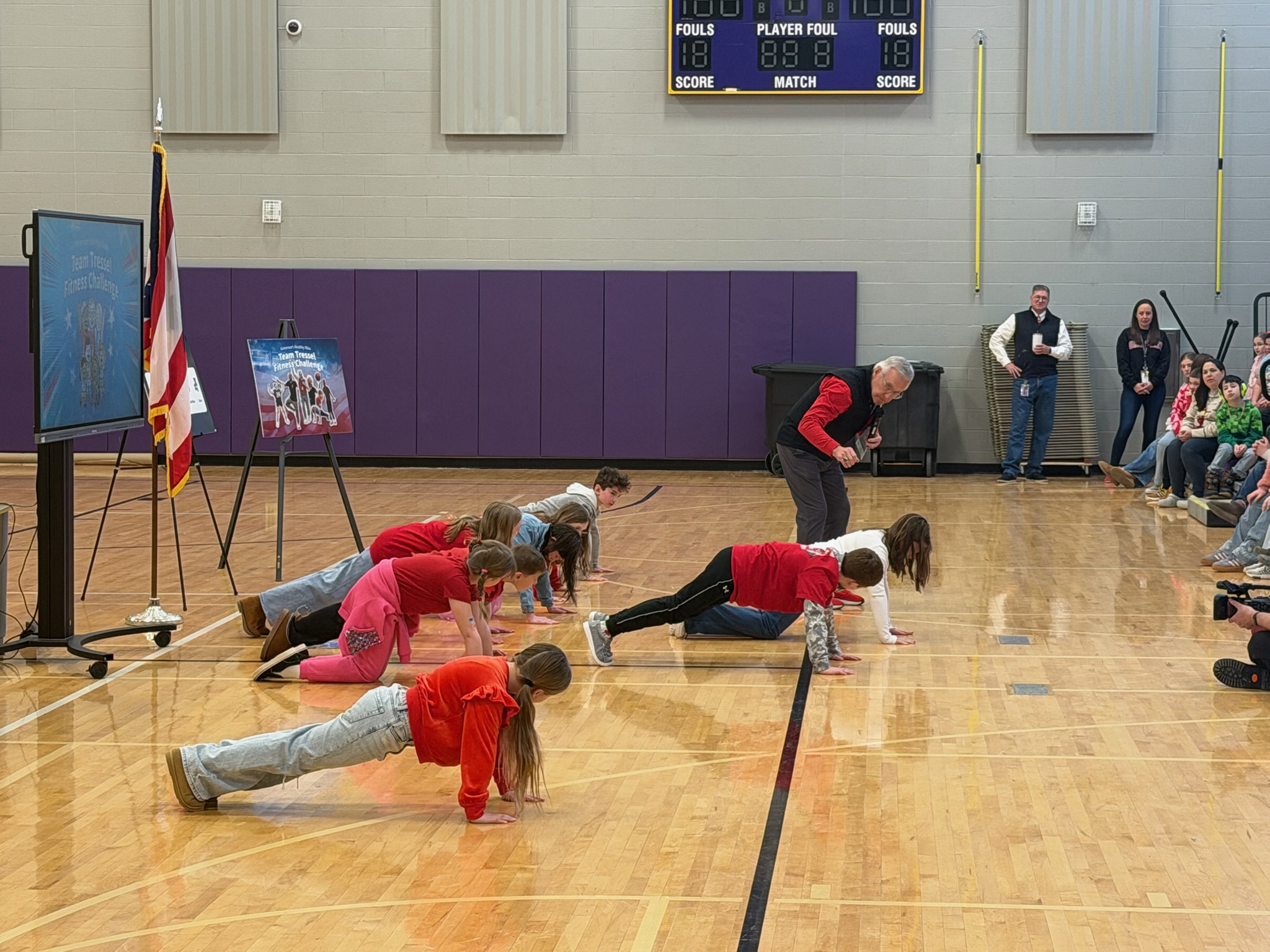 “Tressel used student volunteers to help demonstrate the importance of his key areas of focus, including cardio, strength, flexibility, nutrition and sleep as part of a 30-day program challenge targeting third- through eighth-graders across the state,” Crooks wrote, adding students performed push ups, planks, squats and stretches.