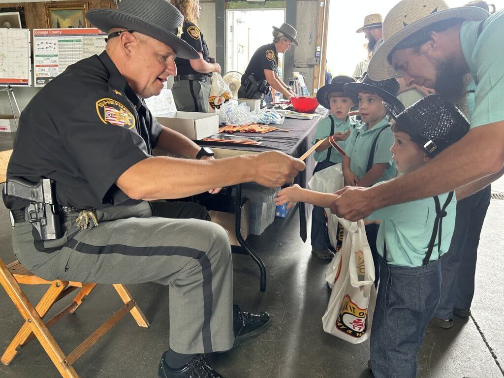 Sheriff Scott Hildenbrand, who had been handing out packets to Amish children during the afternoon, accepted the check.