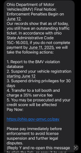 “Ohio residents have reported receiving text messages from scammers claiming to be from BMV and informing the recipients that they have an outstanding traffic ticket,” the Ohio BMV said in a press release. “The text then instructs the recipient to pay immediately to avoid a license suspension.”