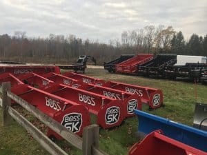Moritz flat bed trailers, Big Tex dump trailers, red Boss and yellow Snow Wolf plows and Salt Dogg spreaders crowd the northwest corner of Kinsman and Ravenna roads in Newbury Township.