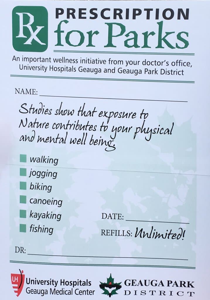 Each prescription card says, “Studies show that exposure to nature contributes to your physical and mental wellbeing,” and is paired with a map of all Geauga Park District parks ready to visit.