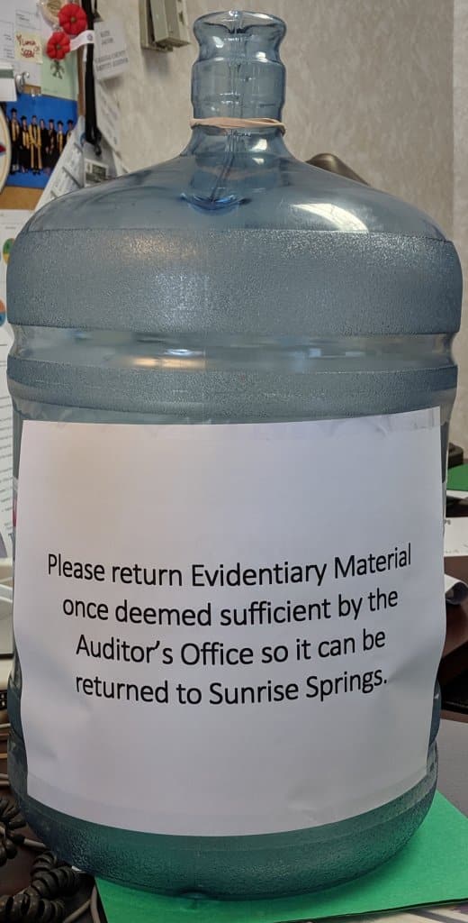 When asked for documentation on a water cooler contract with Sunrise Springs, Jacob said the court submitted an empty five-gallon jug with a receipt stuffed in the spout.
