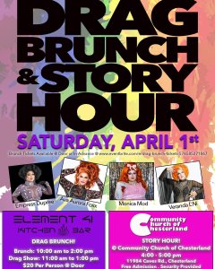 At 4 p.m., the church is hosting a drag story hour at its Chester location, 11984 Caves Road. Ohio performers Empress Dupree, Ava Aurora Foxx, Monica Mod and Veranda L’Ni will be reading children’s stories at the event.
