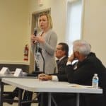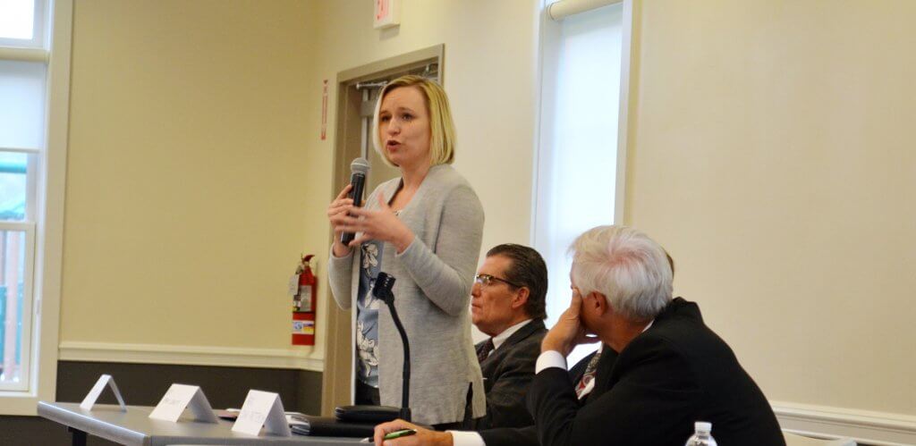 The audience submitted several anonymous questions on index cards, on topics including renewable energy, infrastructure improvements, oil and gas drilling in parks, education funding, women’s health and opting out of school testing.