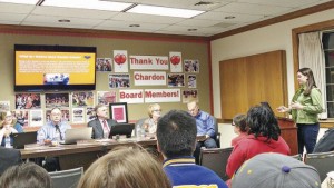 Hannah Mean, a member of the Student Principal Advisory Council at the middle school, gathered quotes from her fellow students to share at the meeting because she is passionate about sharing “what CMS loves about Chardon Schools.”