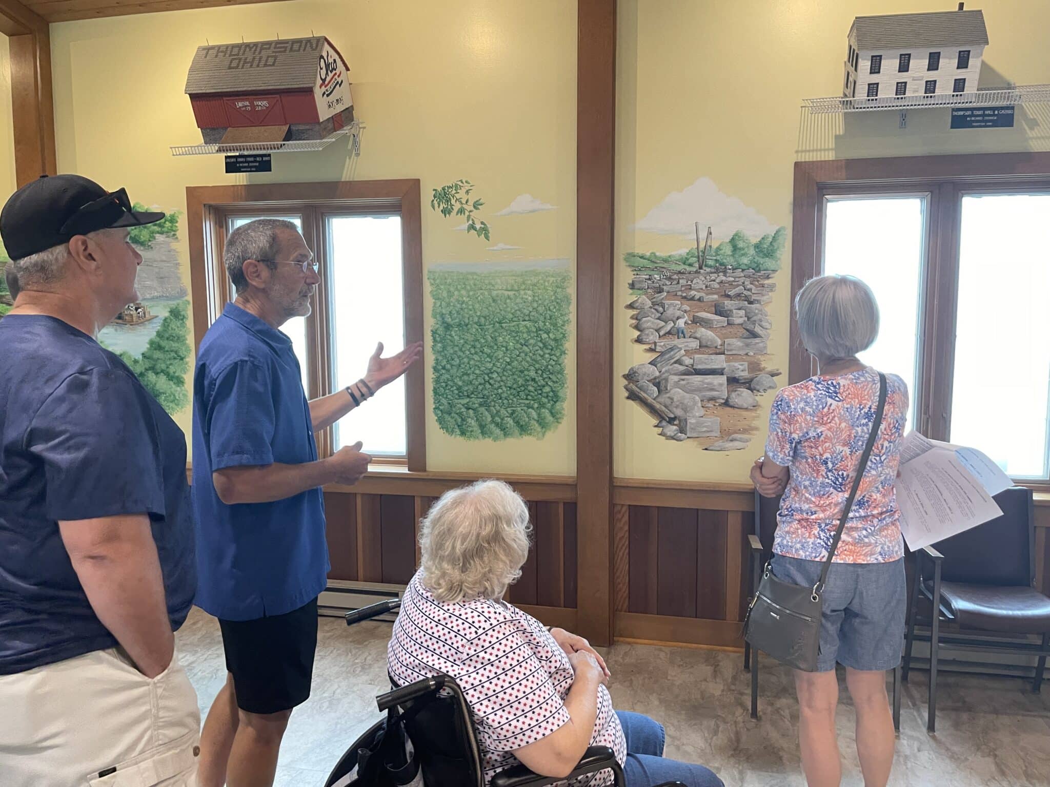 One large mural depicts Thompson Square in the early 1900s, with seven smaller murals showcasing the first inhabitants, settlers, Irish immigrants, World’s Fair, Josef and Bertha Ornstein’s dairy farm, an ownership map for the southeast portion of Thompson Township and Thompson Ledges Township Park in 1941.
