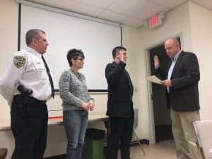 A festive crowd attended the Feb. 14 Chester Township Trustees meeting to witness officer Nicholas J. Iacampo being sworn in as a new member of the Chester Township Police Department.