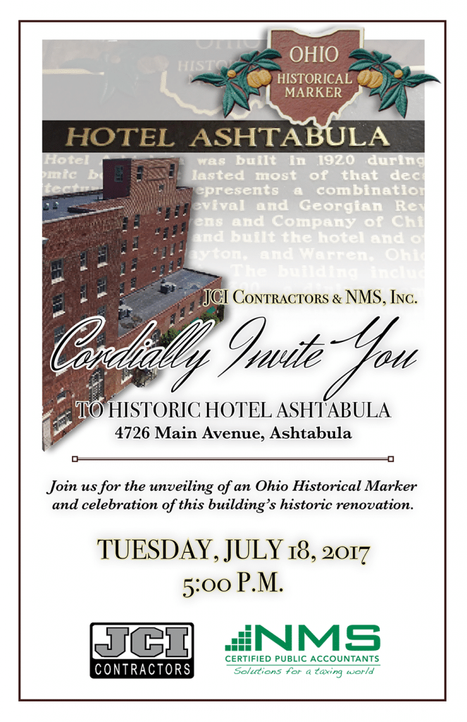 The marker honors the site of the largest historic redevelopment and adaptive reuse project in Ashtabula County’s history, the former Hotel Ashtabula at 4726 Main Avenue.