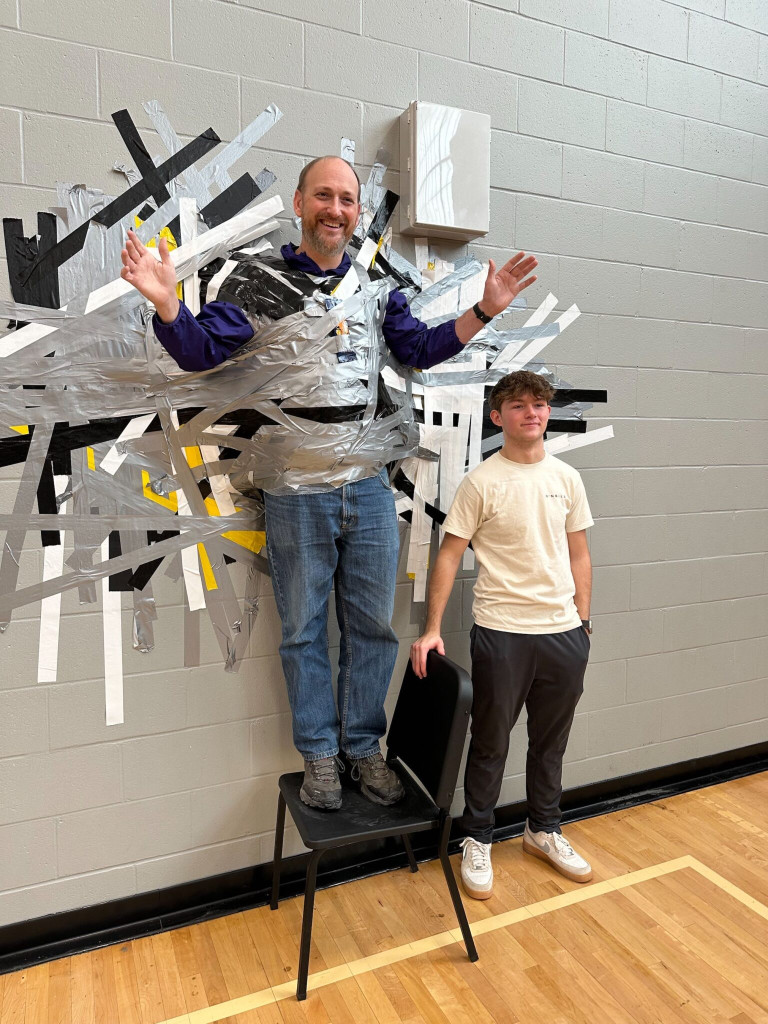 The initiative, led by student Chris Buyea-McDonald, encouraged donations through a creative incentive: for each food item donated, students earned a piece of tape to help secure Mr. Koterba to the wall. The event brought the school community together, promoting generosity while adding excitement to the school day. By the end of the drive, Mr. Koterba was fully secured to the wall, much to the delight of students and staff.