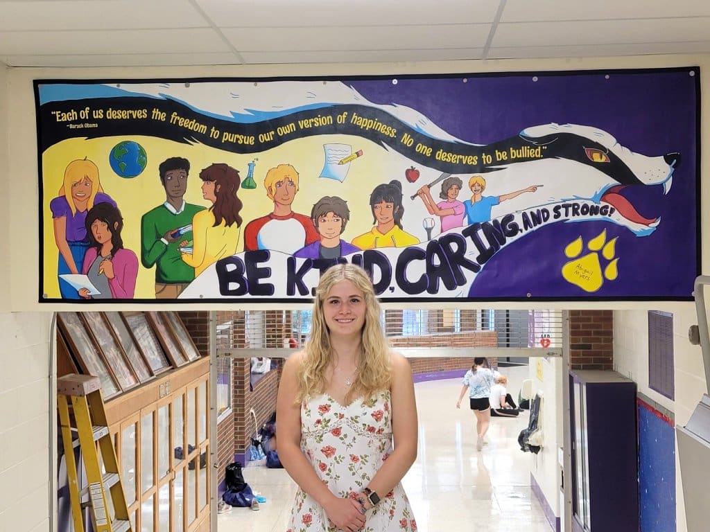 Abigail is a 13-year member of the Girl Scouts. To complete her Gold Award project, she was required to invest approximately 100 hours of time. Only approximately 5 percent of eligible Girl Scouts complete the milestone. For her project, Abigail chose to draw a mural that sends a message to discourage bullying and uplift and inspire those around us.