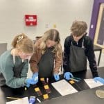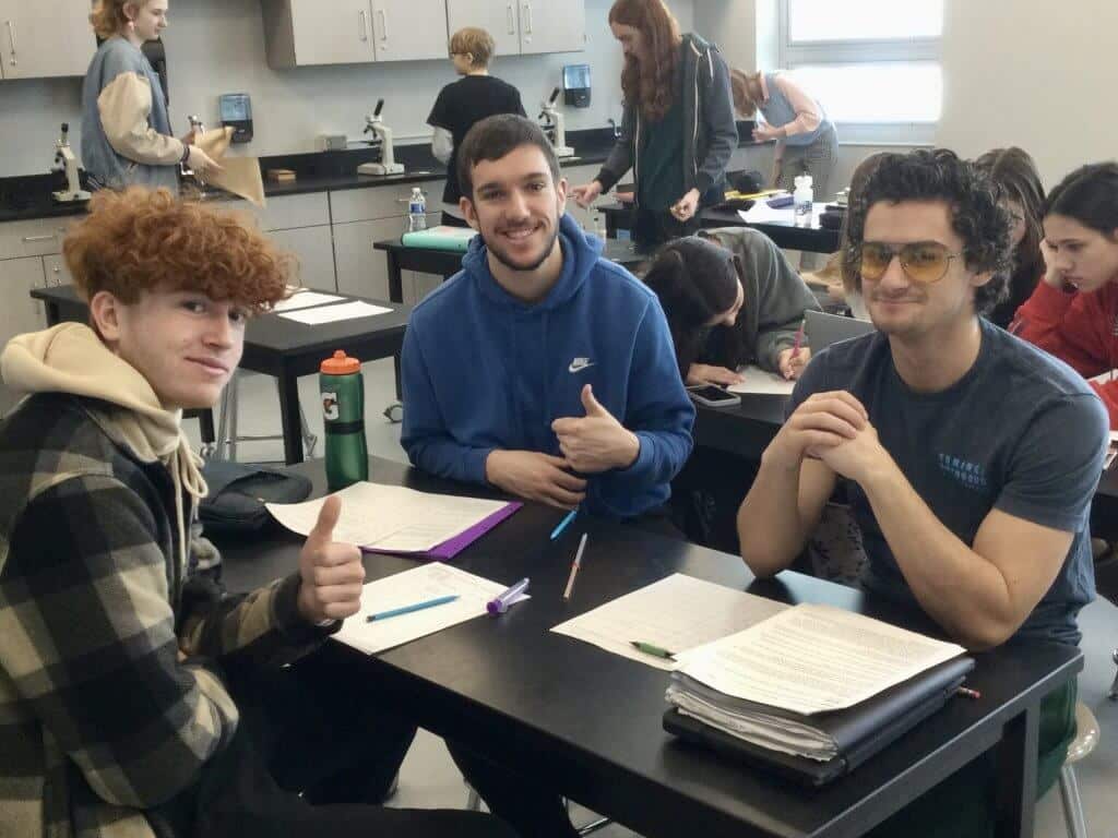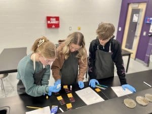 Berkshire High School students in anatomy and physiology recently completed a simulated blood typing activity. Students used fake blood to determine the blood type of the class’s accident victim, John Phranks, and compared it to four individuals who were “blood donors” at the American Red Cross. The students determined that the victim needed a transfusion and identified the two possible donors that exhibited blood compatibility.