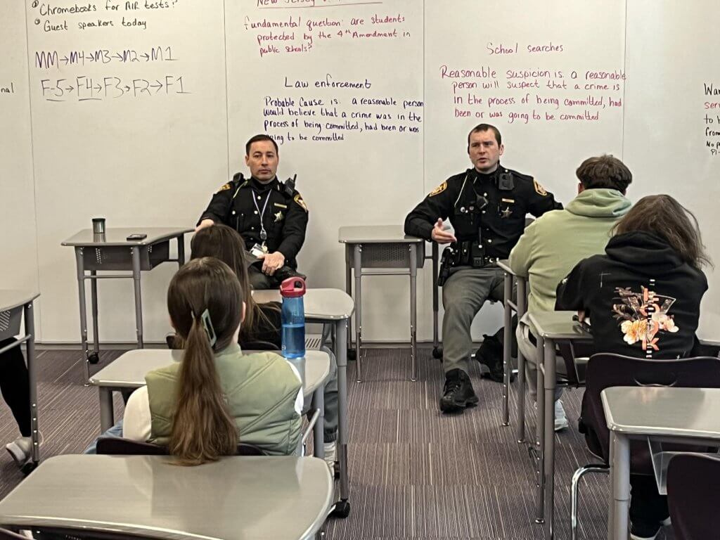 Berkshire school resource officers and Geauga County Sheriff Deputies Joe Ray and Josh Mikolajski recently visited with Mr. Higgs’ U.S. Government classes. The deputies’ primary focus was to educate students on the procedures that take place during traffic stops.