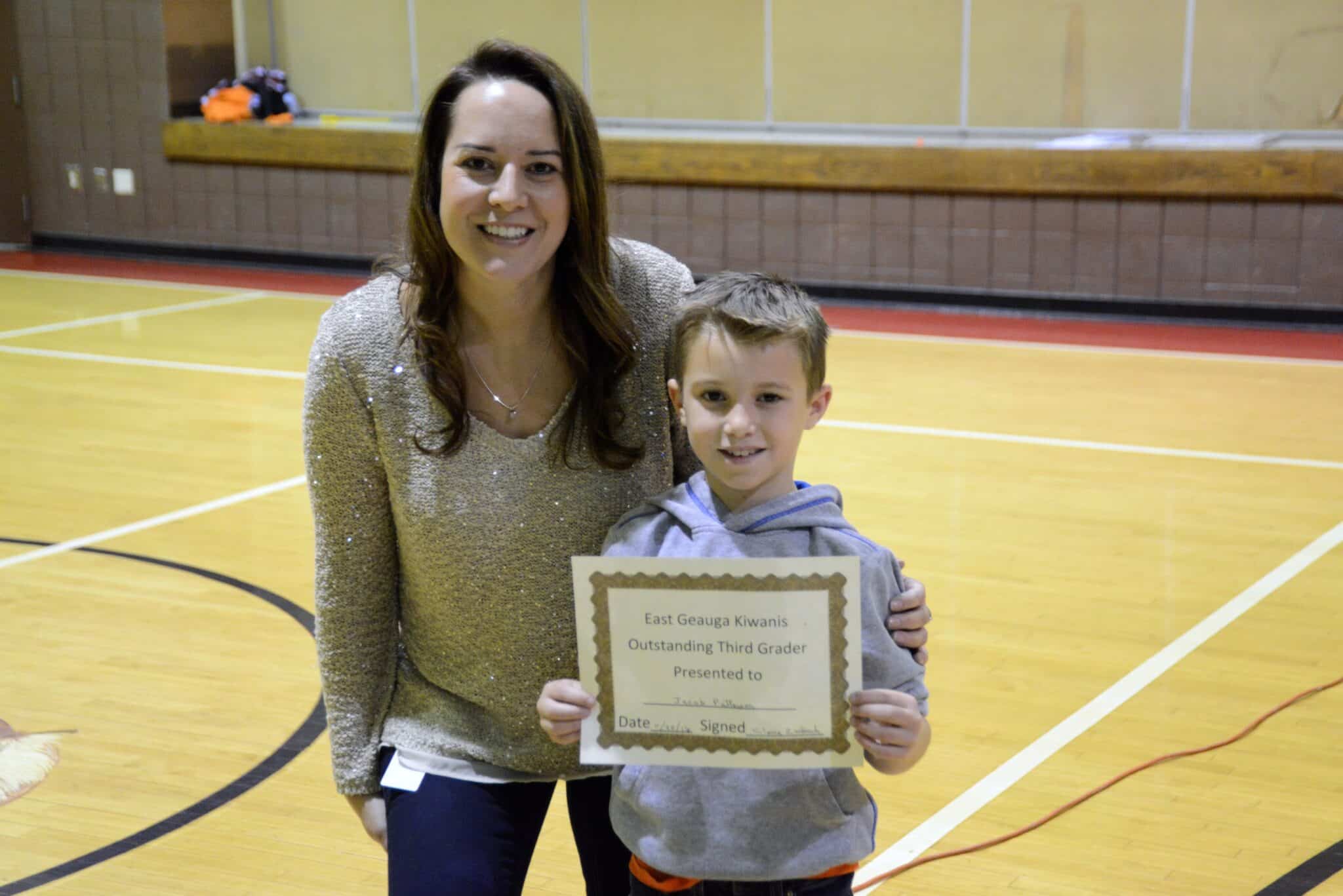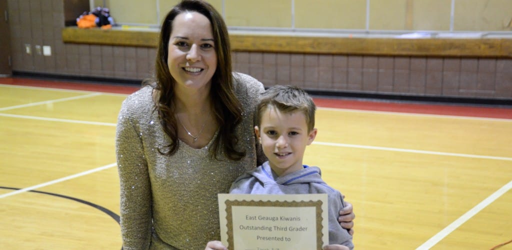 East Geauga Kiwanis Club recently gave recognition to Ledgemont Elementary School third-grader Jacob Patterson for being an outstanding student as chosen by his teacher. He received a certificate and four literature books. With Jacob is Principal Kelly Timmons.