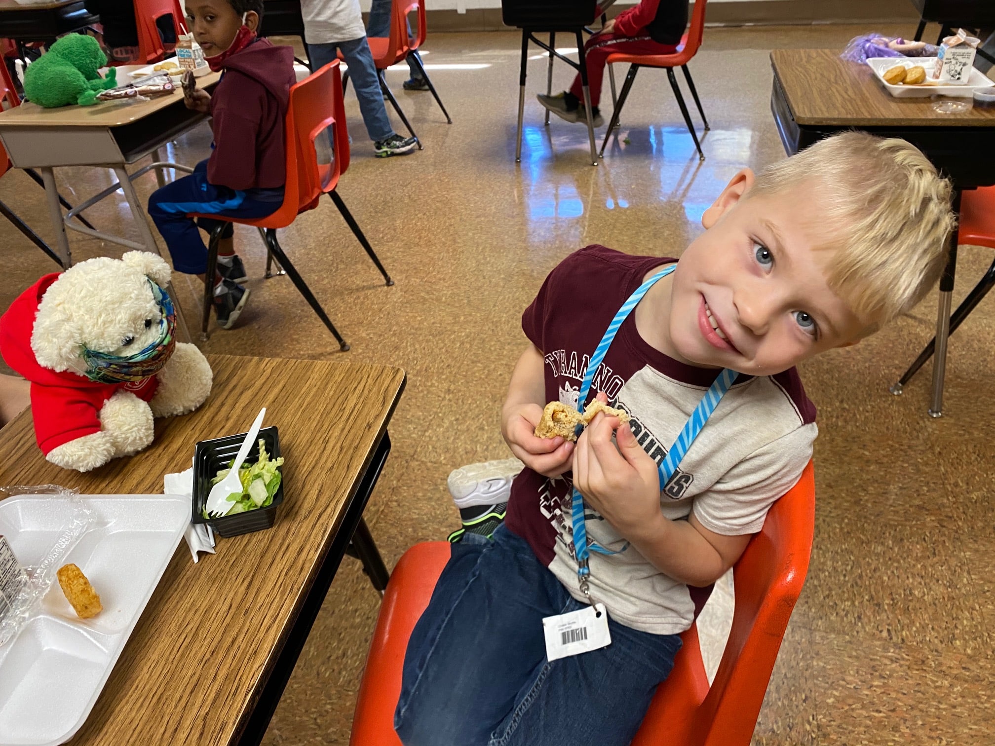 The students love showing and sharing their favorite buddies with their friends and the wonderful cafeteria staff always prepares a fun pancake lunch to go along with the occasion. All the lunch visitors kept the appropriate social distancing and some even wore masks.
