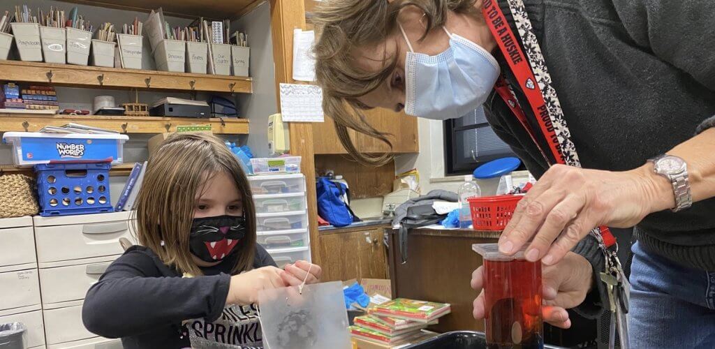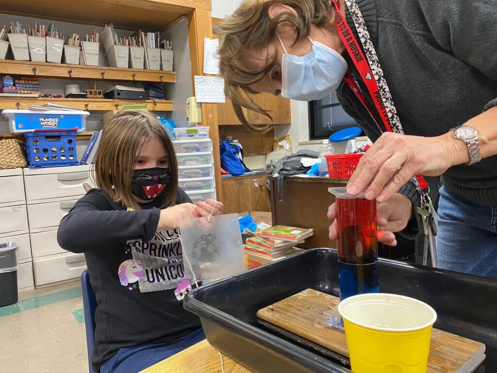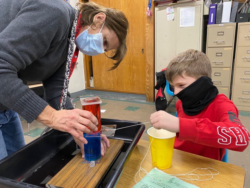 Science consultant Claire Zurbuch (aka Mr. Z.) visited students and provided a lesson on liquid density in Mrs. Jan Maxwell’s class. The underlying idea is that liquids that are less dense will rise, or float to the top, since students are working with liquid.