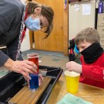 Each student was given a beaker of warm water that was colored red and a beaker of cold water that was colored blue. A clear, thin plexiglass square with a string attached was placed on top of the water beaker that was not anchored. The beaker and the plexiglass were then flipped over to rest on top of the other beaker that was anchored to a piece of wood. Mr. Z. and Mrs. Maxwell then walked around to each student’s desk holding the water beakers while the students pulled out the plexiglass, separating the two containers of water.