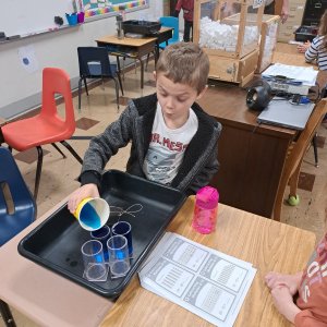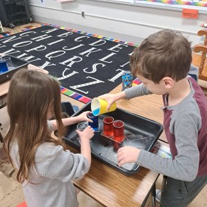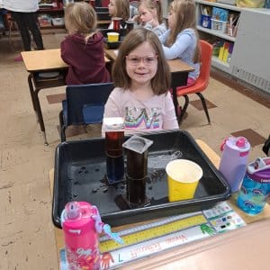 Claire Zurbuch (Mr. Z) recently conducted a science experiment with the first-grade students in Mrs. Horvath’s class at Jordak Elementary School. The students put warm water that was colored red in two clear containers and cold water that was colored blue in the other two containers. They then put a warm water container on top of a cold water container and vice versa.