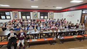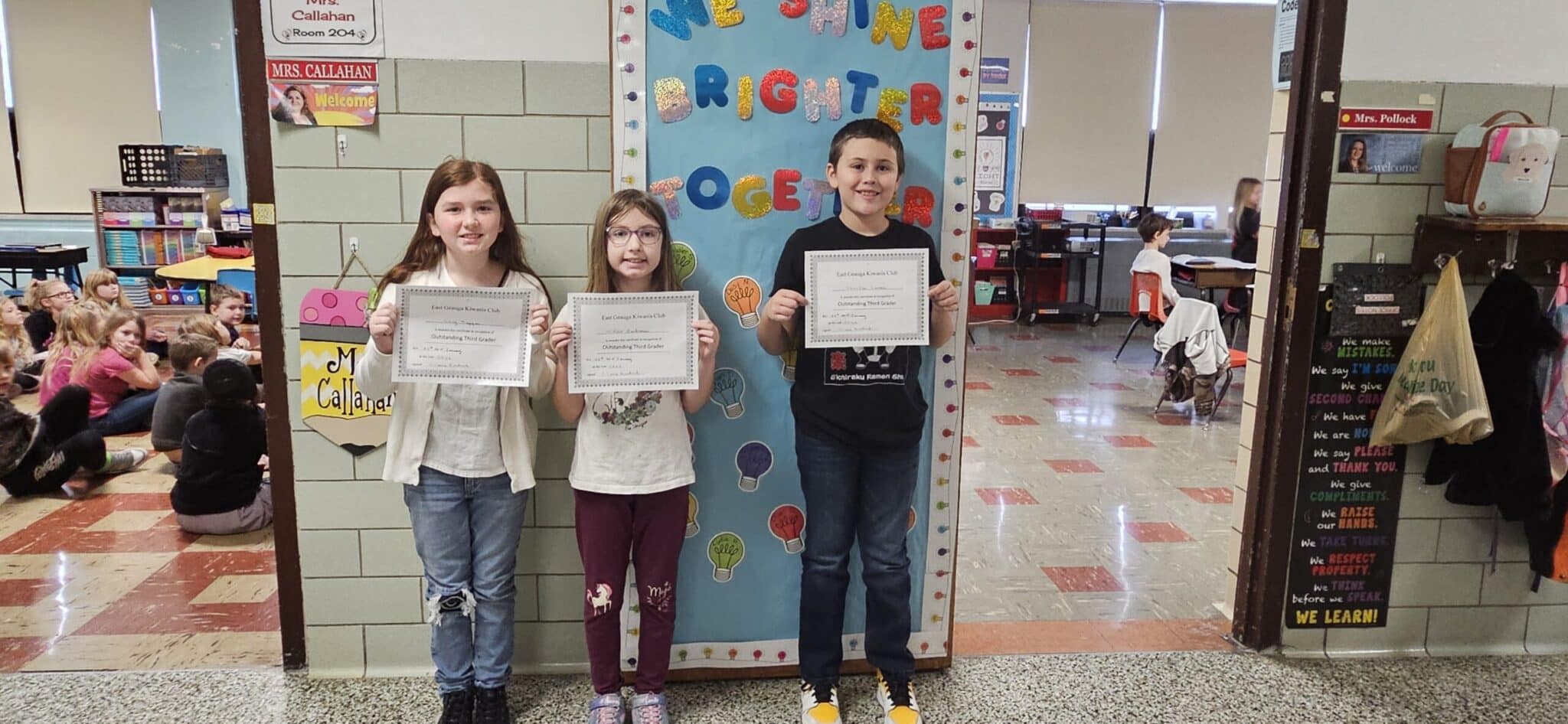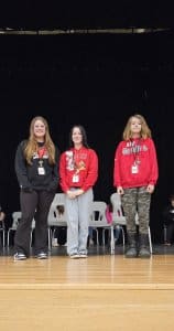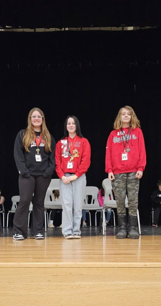 Seventh-grader John Loving, right, was crowned the 2023-24 spelling bee winner. Loving made it into the 10th round by successfully spelling “fluke.” Eighth-graders Sydney Lehr, left, and Emerald Mena, center, were First and second runners-up, respectively.