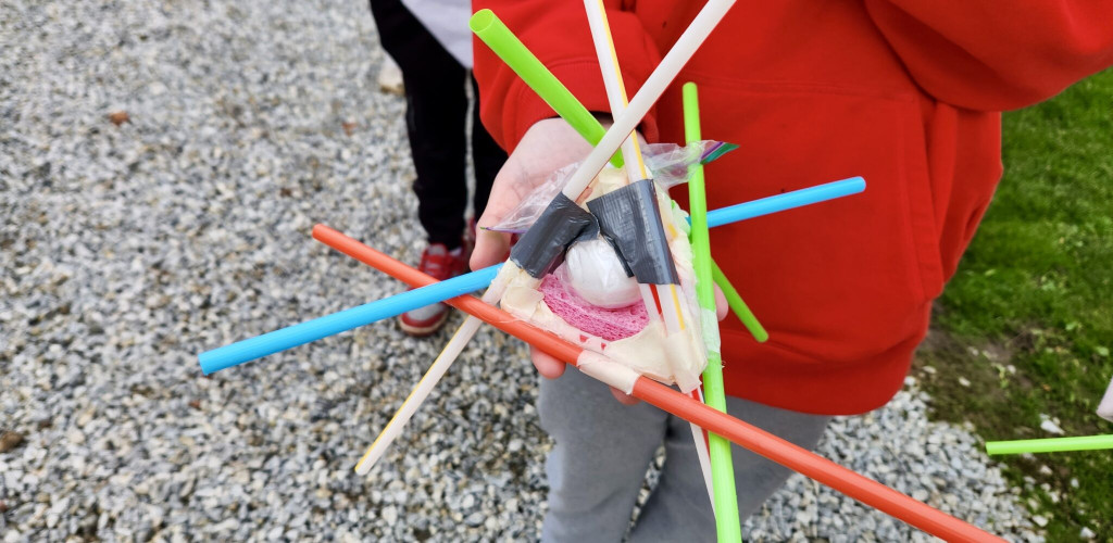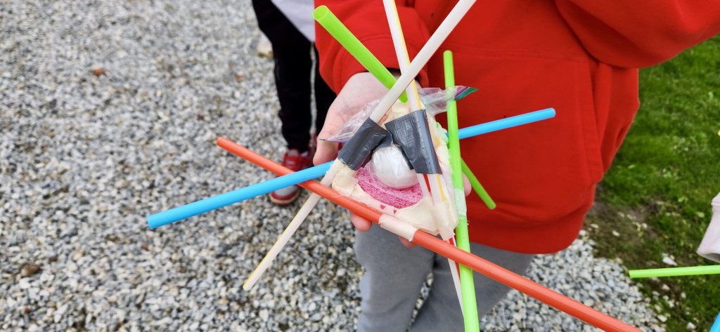 Mr. Clutter’s science class recently participated in the famous egg drop experiment. Students designed creative contraptions to protect their eggs, ensuring they wouldn’t crack when dropped by teachers and staff from the athletic stadium bleachers.