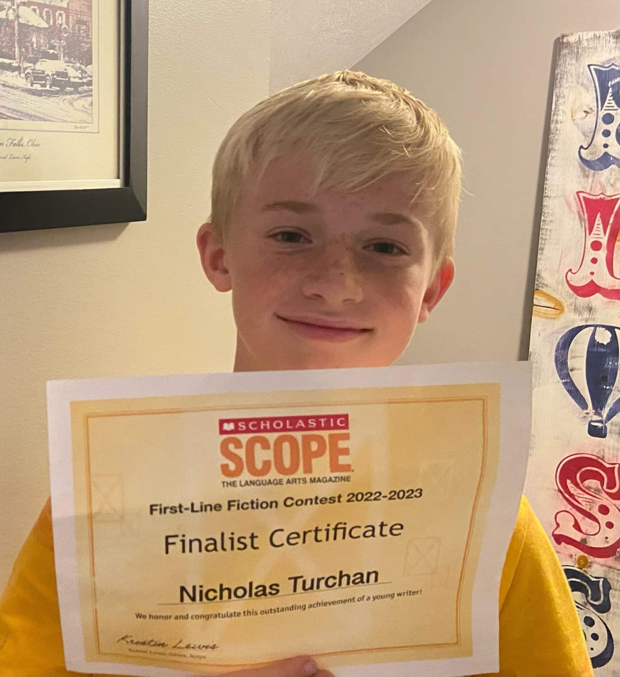Nicholas (Nicky) Turchan, a current seventh grader at Chagrin Falls Middle School, was chosen as a finalist for Scholastic’s Scope’s First-Line Fiction Contest 2022-23. Scholastic received hundreds of entries from students around the country, and Nicholas’ story submission stood out.