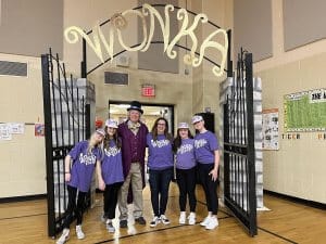 Bringing the whimsical world to life even further, a giant Wonka gate archway was constructed by the Chagrin Dads’ Club and placed at the gym entrance. Students enjoyed walking through the magical gates into the Wonka Chocolate Factory and seeing the flowing chocolate river. Chagrin PTO members transformed each hallway of the building into a room of the chocolate factory.