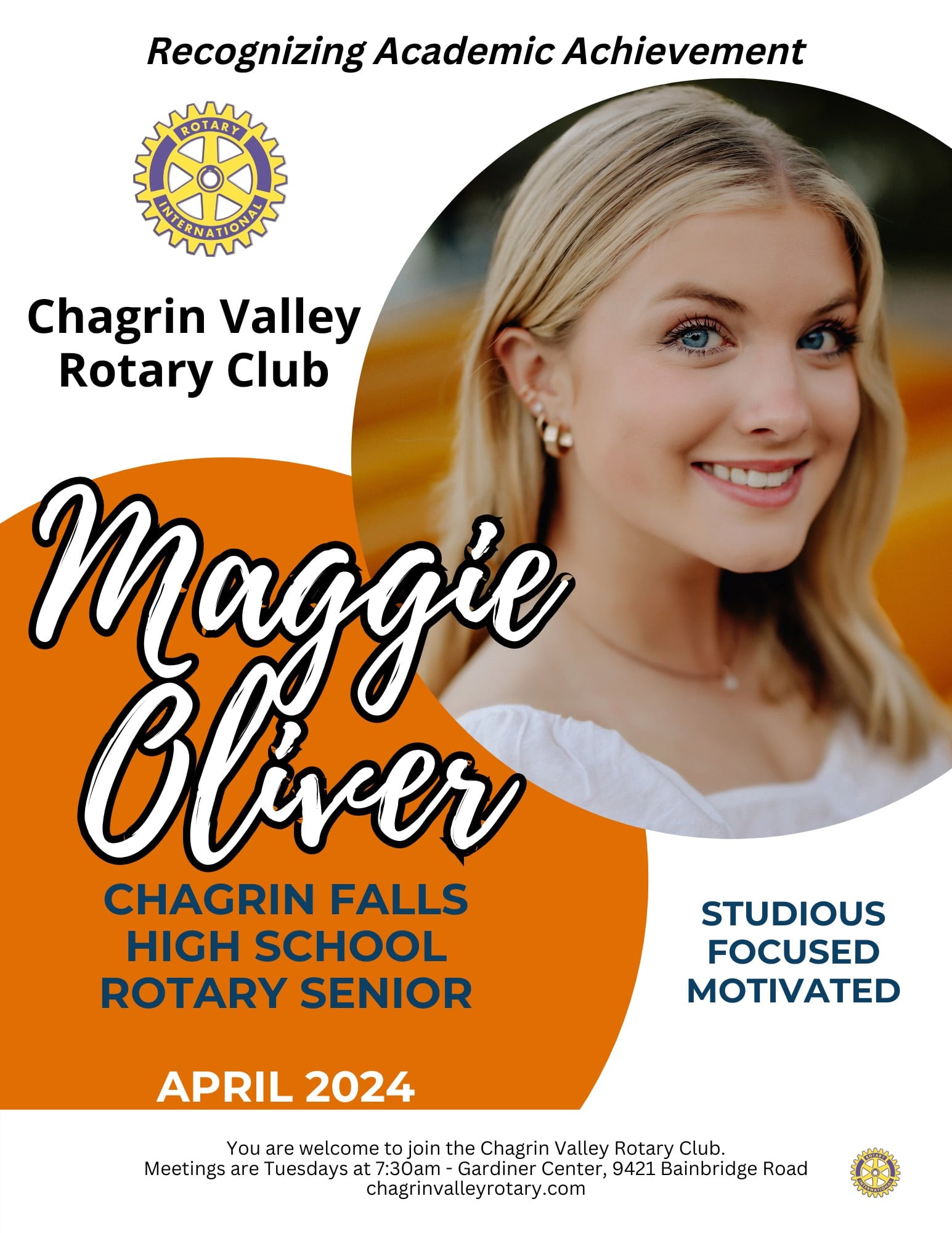 The Chagrin Valley Rotary Club has selected Chagrin Falls High School’s Margaret Oliver as their Student of the Month for April 2024. This prestigious award recognizes Oliver’s outstanding achievements both inside and outside of the classroom.