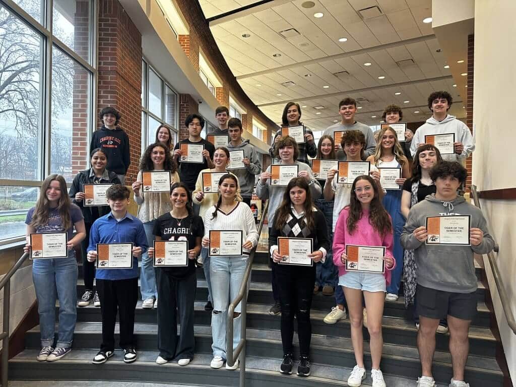 The Tiger of the Semester Award is presented to students who exemplify a positive attitude, work ethic, achievement in the classroom and service to fellow students and teachers at Chagrin Falls High School. Teachers nominate one student from their classes who impressed them with their achievement, attitude, hard work, willingness to help others and growth during the first half of the year. The award program is sponsored by Interact Club. Advisors Karen Sindelar and Janet Coriell organized the interactive presentation that featured personalized messages from each teacher who nominated a student. Visit the district website to view the presentations.
