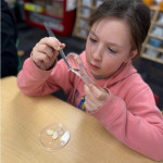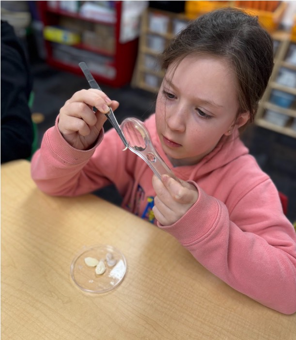 Meanwhile, in Gallik’s second-grade STEM class, students have been learning about pollination and seed germination, starting with a hands-on simulation of bees pollinating flowers. Afterward, they got a closer look at plant life by dissecting seeds to explore their structure and learn how plants grow.