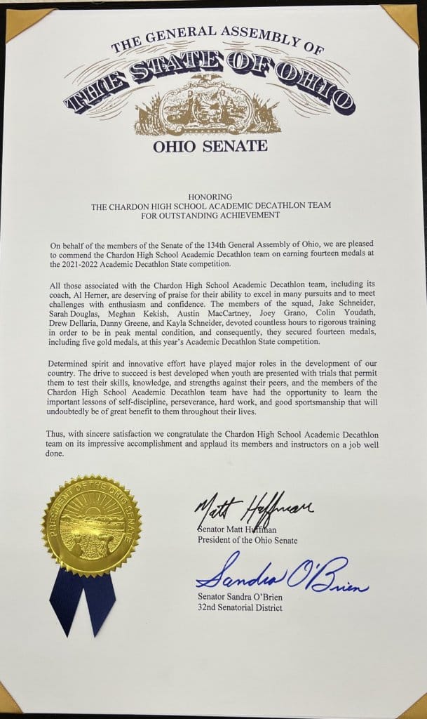 Chardon High School’s 2021-22 Academic Decathlon team was recognized during summer break by the Ohio Senate and state Sen. Sandra O’Brien. A resolution was passed honoring the team and their achievement of 14 medals in the 2022 state competition.
