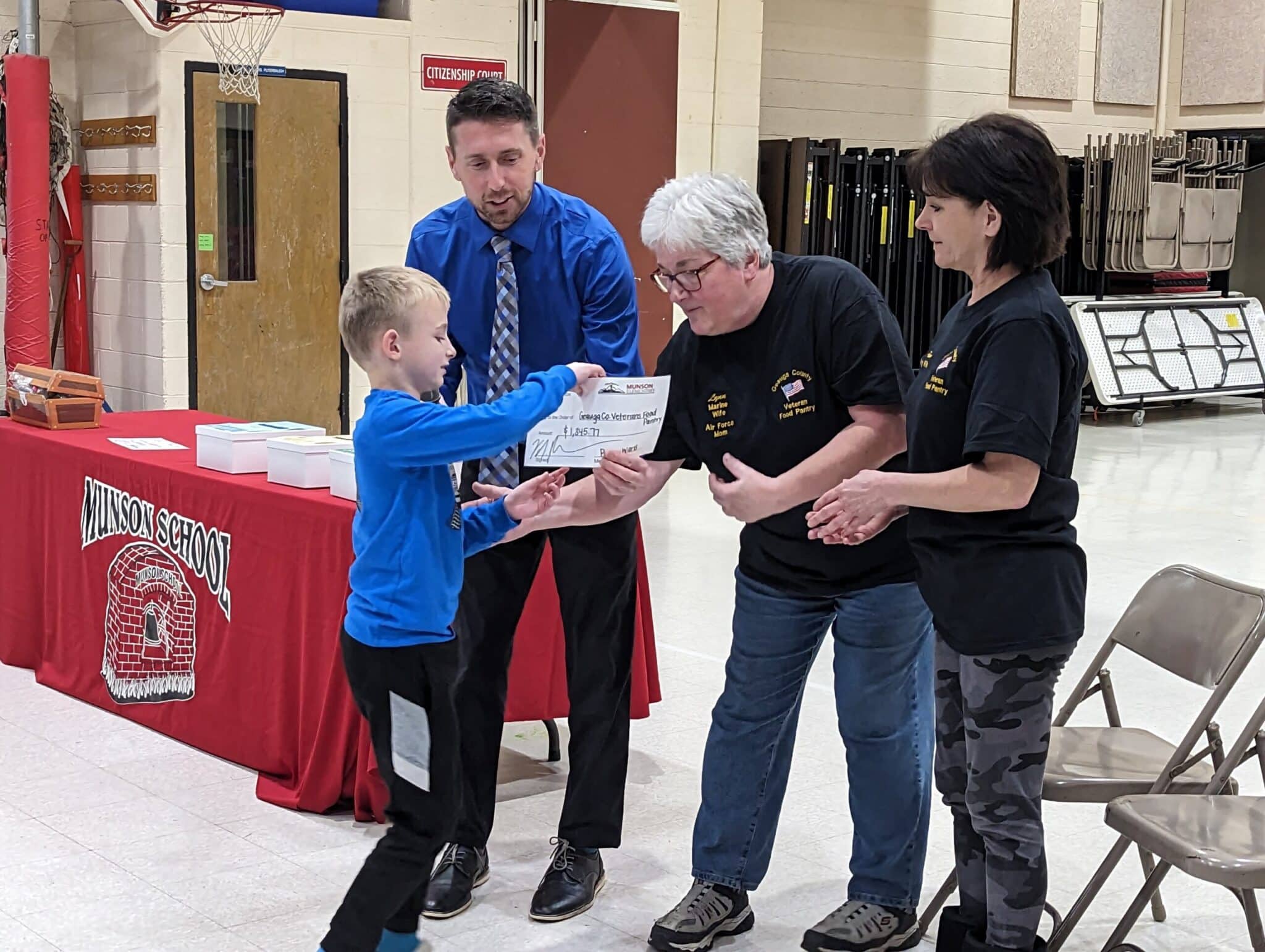 A Jan. 12 school assembly hosted the Geauga County Veterans Food Pantry. In attendance were the food pantry’s director Lynn Algeri, pantry supervisor Pam Wiech and IT/communications representative Chris Larker. Third-grader Ethan Ovanic had the honor of awarding Ms. Algeri and Ms. Wiech with Munson’s presentation version of the check during the assembly.