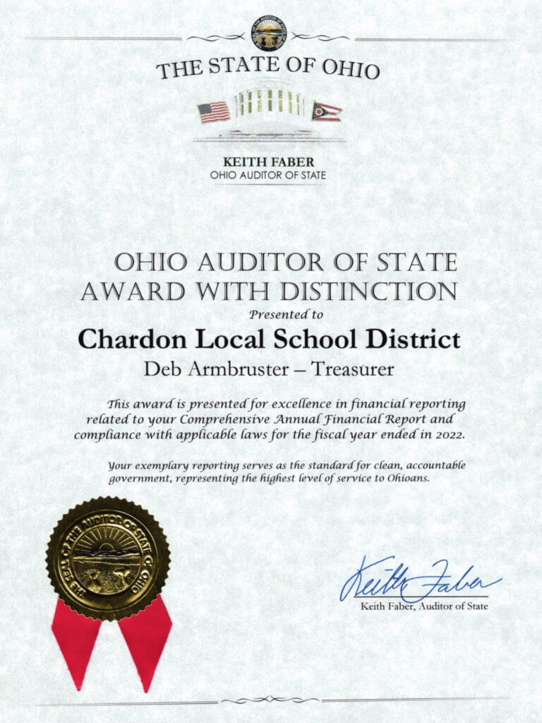 A round of well-earned applause for Chardon Schools Treasurer/CFO Deb Armbruster and her team. Armbruster received an unannounced visit from the Ohio Auditor of State Keith Faber at the Chardon board office on March 23 wherein Auditor Faber presented her with an OAS Award with Distinction. The honor recognizes the Chardon Treasurer’s Office for excellence in financial reporting related to its FY 2022 Annual Comprehensive Financial Report and excellence in compliance with applicable laws.