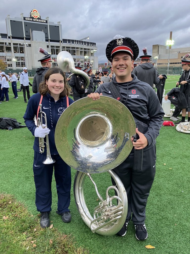 The district is pleased to see Chardon High School alumni Mitchell Ewaska ‘20 and Anna Gerstner ‘21 continuing their journeys in musicality through their respective universities. Ewaska now plays the sousaphone in the OSU Marching Band, and Gerstner is a trumpeter in the Penn State Blue Band. Each student had the prestigious opportunity to perform at their respective schools’ post-season bowl games last month.