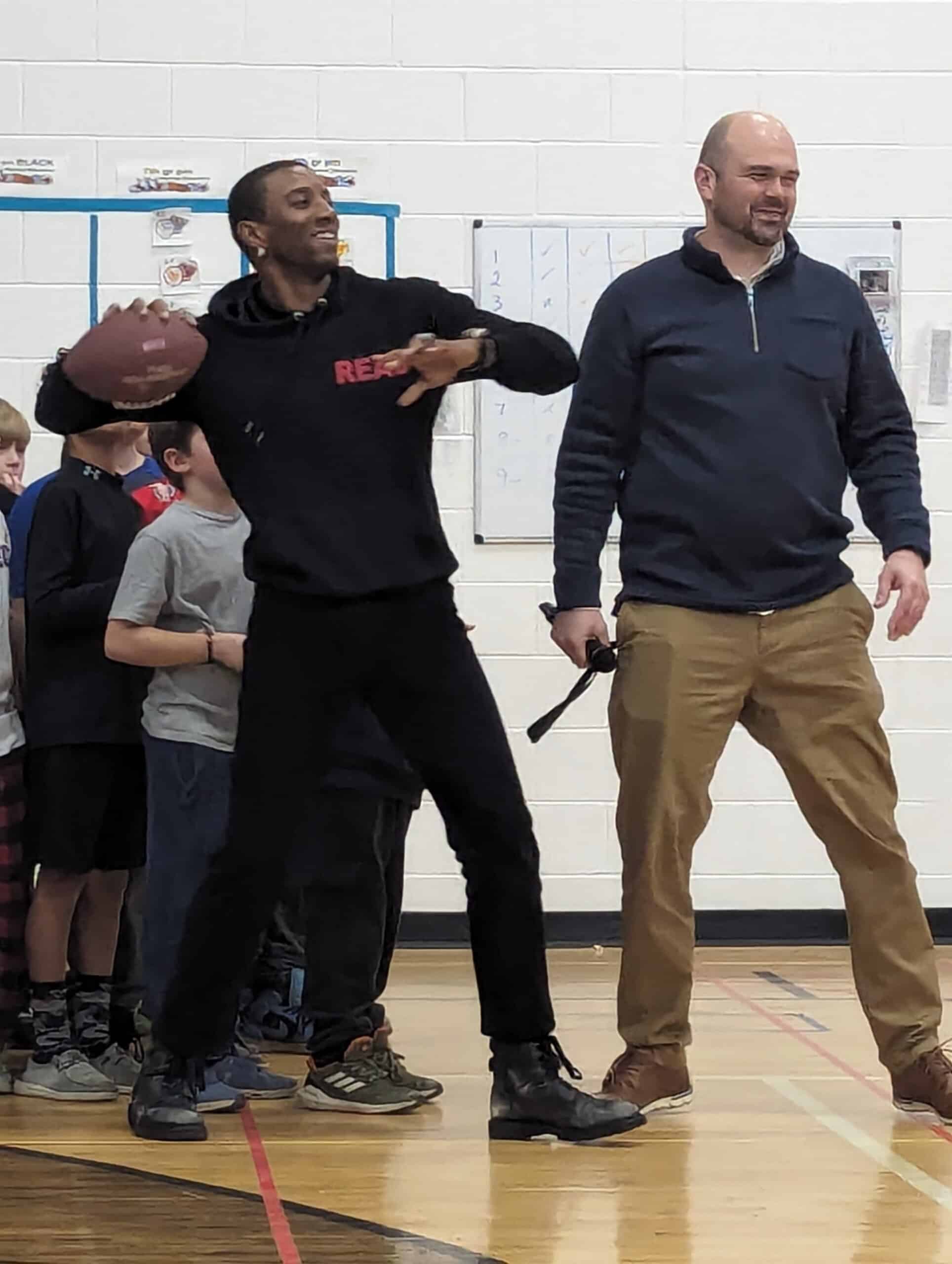 Key event organizer and CMS English language arts teacher Cher Culliton stated, “It was an amazing night seeing students enjoying all of the literacy activities throughout the building and then gathering to hear Malcolm’s message. He tossed the football around with the kids in the gym before his presentation and stayed after to sign autographs for every kid.”