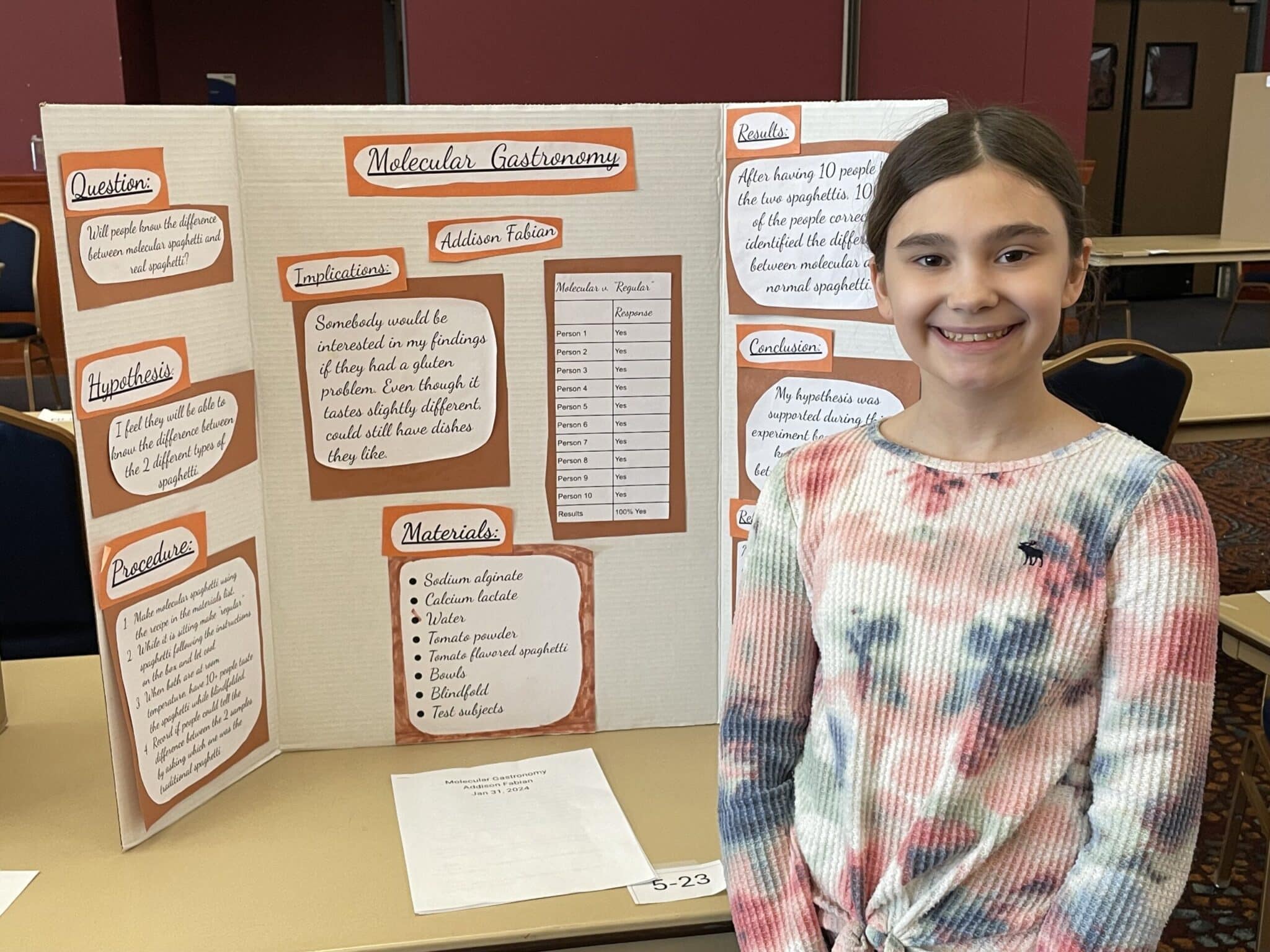 Seventh-grade science teacher Jackie Brown described Addi’s project, stating, “For Molecular Gastronomy, Addi made an alternative type of tomato-based pasta and in a blind taste test, had test subjects see if they could tell the difference between the alternate and traditional pasta. She wanted to see if there was an alternative pasta for people with gluten issues.”